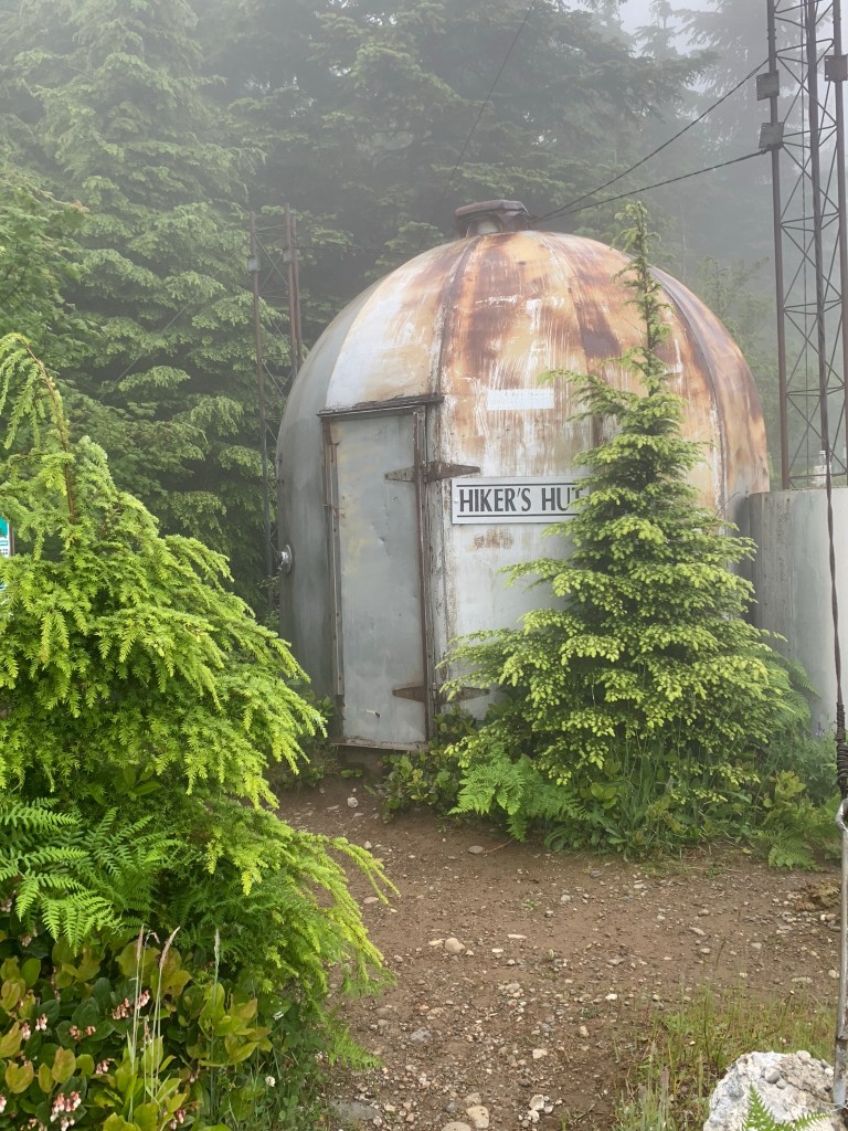 We were making slow progress, I knew. We hit one steep hill, and I cursed. Then I took a breath and made my way up. I reminded myself to be appreciative and amazed at what my body could do. We passed the West Tiger #1 summit. I knew that meant we were closing in other end of this climb. I tried a couple of potato chips, which just turned to unpalatable paste in my mouth. We had dropped below the ridge line, and the light was getting thin. I picked my way over the roots. This time when I popped out at the Hiker’s Hut Viewpoint, I finally had something more than a white wall of fog to check out. We had a gloriously clear view of Tahoma (Mt. Rainier) and, when we turned to the right, the Olympic Peninsula.