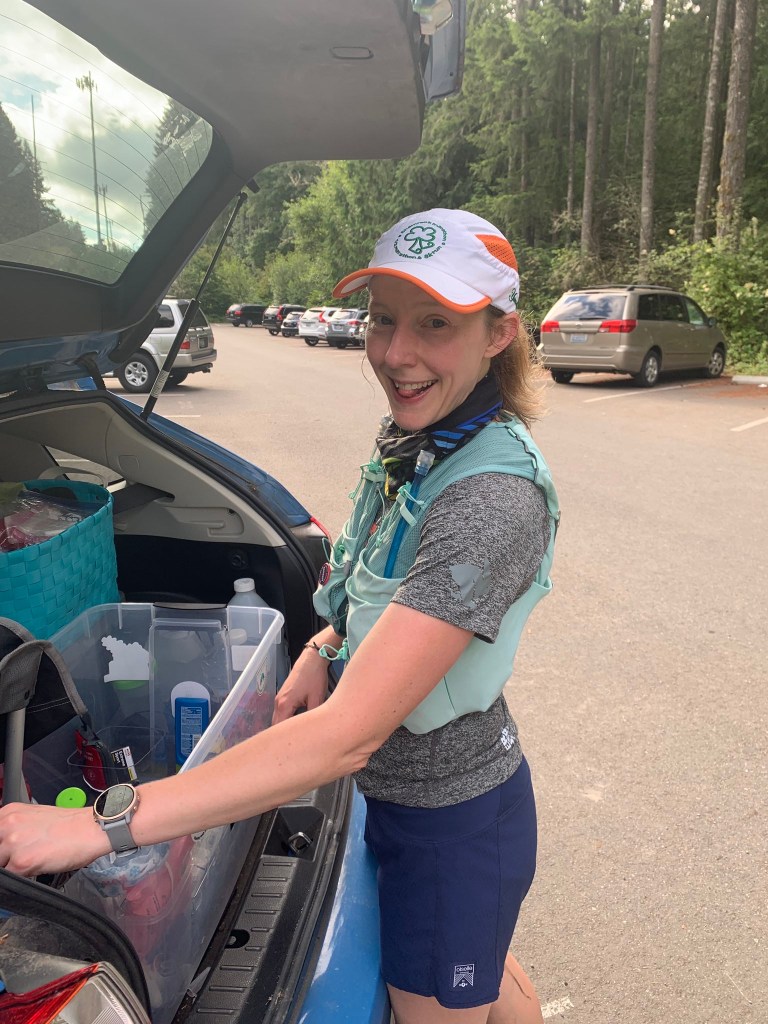 As I tread up the initial climb, I heard a sound and looked up to see a deer further up the hill that disappeared quickly into the brush. As I ran along a flat portion, I hear a small bird shouting and looked up to see a barred owl gliding silently between trees. Heading up the steep final segment to West Tiger 2, I met another runner on the trail. She paused as she passed and asked, “Are you Melissa?” When I confirmed, she wished me luck, asked what my goal was, and told me I was looking strong. (She had seen my post on the Seattle Mountain Running Group page, where I noted I had a big day planned.)