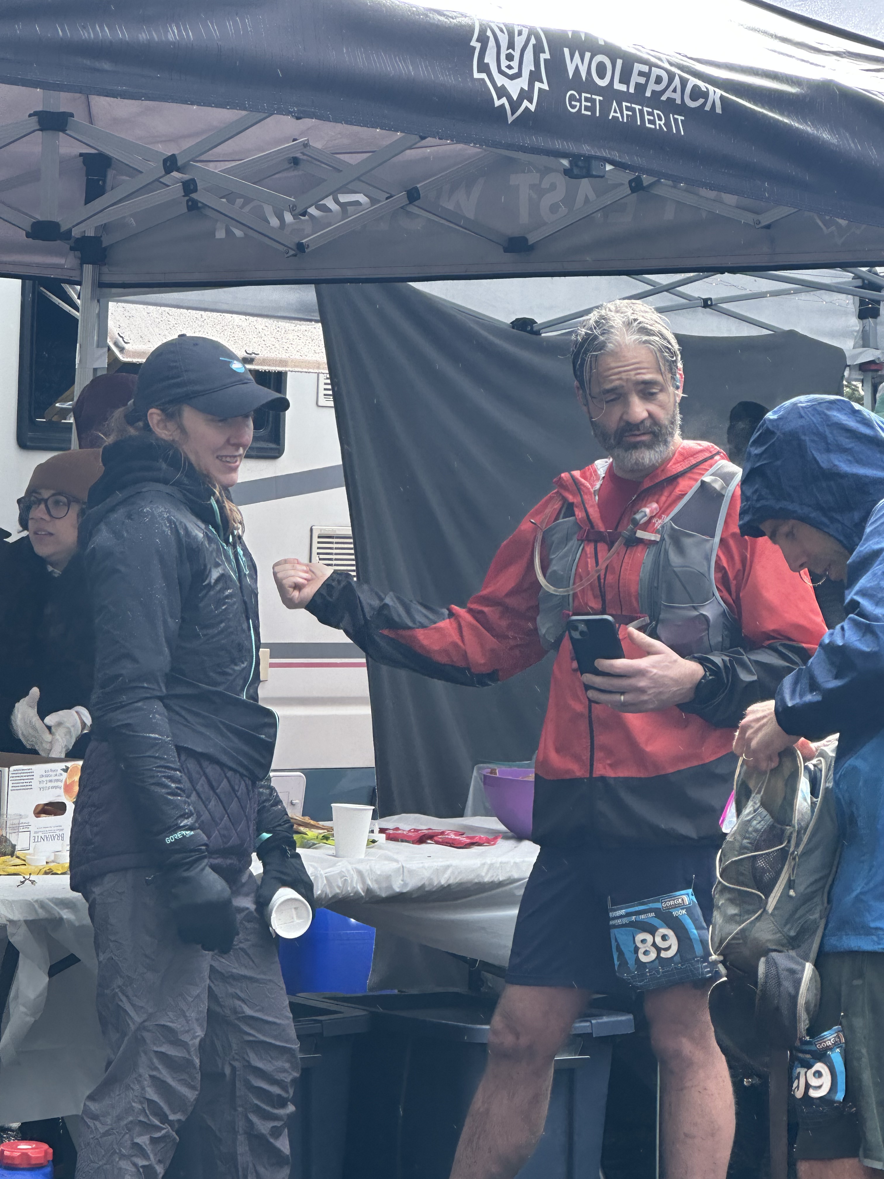 Round 1. I first signed up for the race in 2023. I ended up injured a few weeks before and was just returning to running by race weekend. Could I do the distance? Probably. Would it hurt? Definitely. I didn’t want to jeopardize a trip of a lifetime just a week later, a trail running retreat in Nepal and Bhutan, and decided not to start. I got in a little 4 mi test run on the PCT and felt good. I connected with an acquaintance’s son to take him out to crew his dad, while I headed out to support G and a couple of friends running the race at the 33 mi aid station. I could tell the course conditions were taking a toll. I told G that I could jump in and pace him at 50 mi aid station if he needed it. He did. The weather turned nasty—hail, sleet, cold rain. I got him through his final checkpoint 3 min before cutoff.